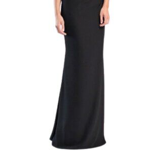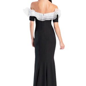 This elegant off-shoulder dress features a striking black design with a delicate white ruffle detail. Perfect for formal occasions, it offers a sophisticated and timeless look.