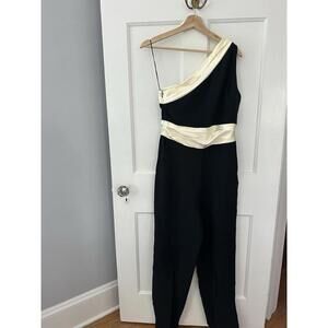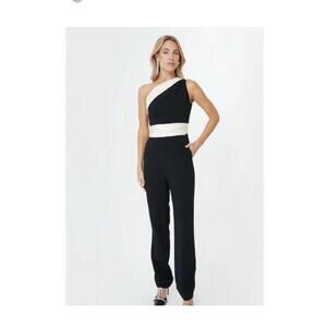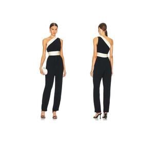 Step out in style with this chic black and white one-shoulder jumpsuit. Perfect for any occasion, this jumpsuit offers a sleek and modern look.