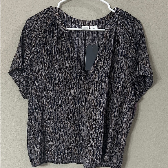 Chic blouse with intricate navy and cream design. Short sleeves and V-neckline. Perfect for casual or dressy occasions.