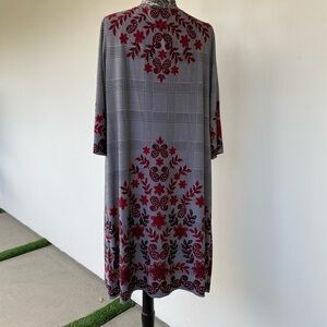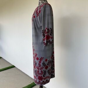 This elegant dress features a striking red floral pattern, perfect for any occasion. The intricate design adds a touch of sophistication to your wardrobe. Sleeves are 3/4 length. Extremely comfortable and easy to slip on. Fabric is 95%polyester and 5%spandex. 40 inches from shoulder to hem. Bust 23, waist 22 1/2 and hips 25 inches.