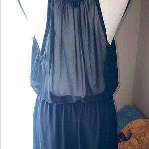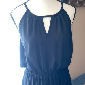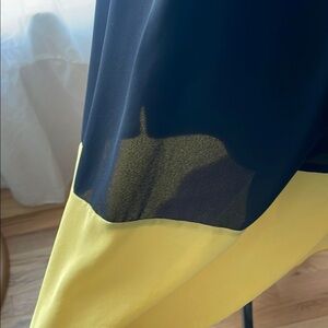 This elegant women's dress features a stylish black top with a vibrant yellow hem, perfect for any occasion. The sleeveless design and keyhole neckline add a touch of sophistication. Bottom is lined but top is slightly sheer.