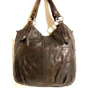 Fossil vintage This elegant black leather tote bag is perfect for any occasion. Its sleek design and durable material make it a must-have accessory main compartment 3 pockets at interior wall 1 zip closure fabric lining open pocket at back lining minor stains exterior have marks creasing stains hight 14” wide 15” depth 3” strap drop 11”The dimensions are based on approximately measurements before placing an order please check take a moment to view all photos using feature for a closer look