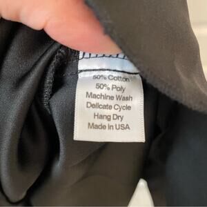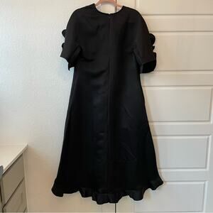 Elegant black dress with ruffle sleeves. Flowy silhouette. Perfect for any occasion. Midi to maxi length and slightly high-low.