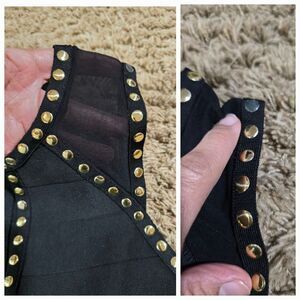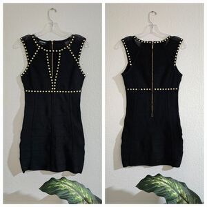 This elegant black dress features stunning gold accents, perfect for any occasion. Its sleek design offers a flattering fit, making it a must-have addition to your wardrobe.