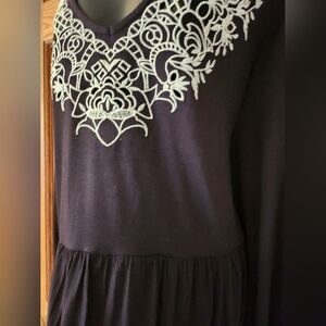 Chic dark blue tunic, with pleated bottom featuring intricate white lace detailing around the neckline.