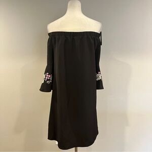 This elegant black off-shoulder dress features beautiful floral embroidery on the sleeves. Perfect for any occasion, it combines style and comfort effortlessly.
