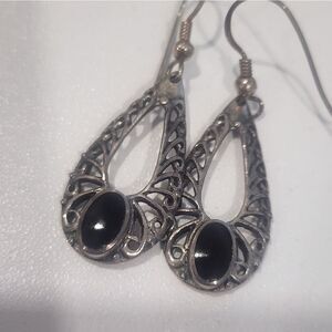 These elegant black teardrop earrings feature intricate detailing, perfect for adding a touch of sophistication to any outfit.