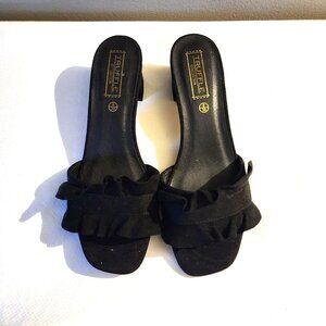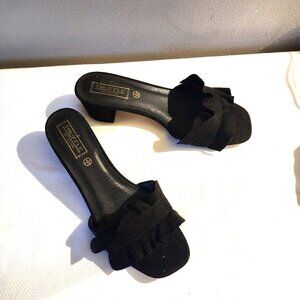 Elegant Blk Sueded Velvet Ruffle Office Siren Cocktail Heel Slide Sz. 39/US 9