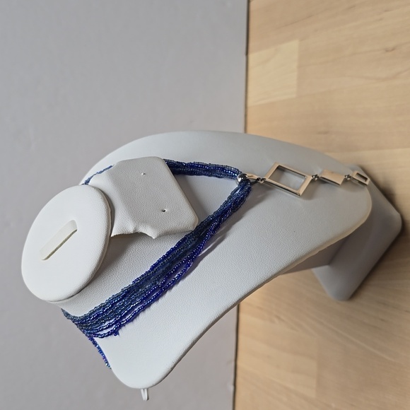 This stunning blue beaded necklace features a unique geometric pendant, perfect for adding a touch of elegance to any outfit. The vibrant blue color makes it a standout piece in any jewelry collection.
