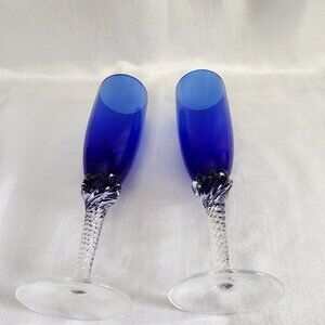 These sophisticated blue crystal champagne flutes are beautifully designed with clear, textured stems. Each glass stands 8.5 inches tall, ideal for celebratory occasions.