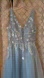 New w tags, This elegant blue gown features beautiful floral embroidery, sheer panel between chest, inside chest pads, zip up.