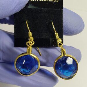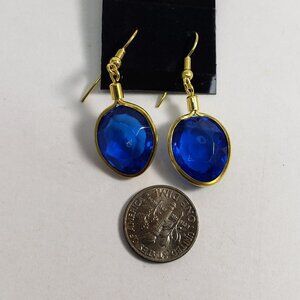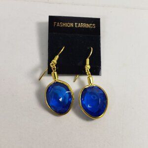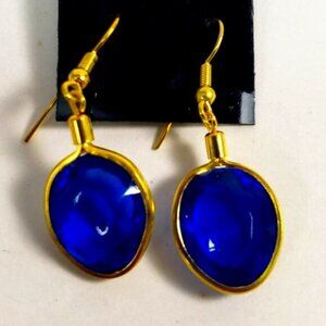 Elegant Blue Gem 1.5" Drop Earrings – Gold Tone Oval Dangle, Lightweight Jewelry