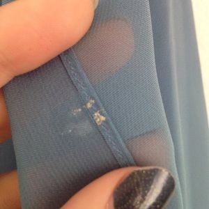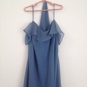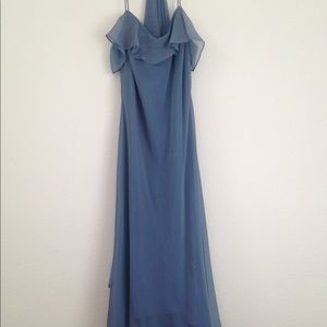 Hi-lo style, chiffon overlay, spaghetti straps, and it even has a little chiffon shawl that matches. Gorgeous multi dimensional blue fabric. A couple light stains on the gown and one on the shawl (shown in pictures). Never tried removing them, but a trip to the dry cleaners might just do it.