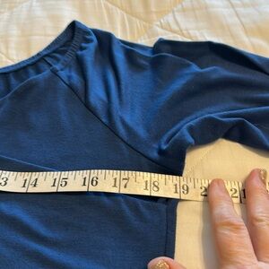 Stylish blue maternity dress with a flattering fit. Perfect for any occasion. I put the measurements in the pictures. There is a lot of stretch. I put nwt but I took my daughter’s photo to sell the dress. It is much prettier on than it looks on the rack. It is so soft. She is 5’9” and wore flats. I am including the floral belt and a floral hair piece. Smoke and pet free home. Thank you for shopping my closet.I am open to reasonable offers.
