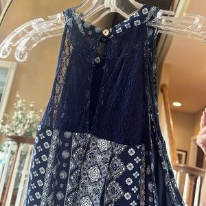 Boutique-style A-line dress in rich navy with lace detail at the top. Flowy fit, fully lined, 100% polyester. Lightweight and comfy. Perfect for warm weather or layering. Gently worn, great condition. Boutique find, orig. approx. $54. Size M.