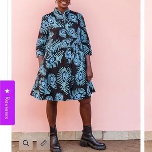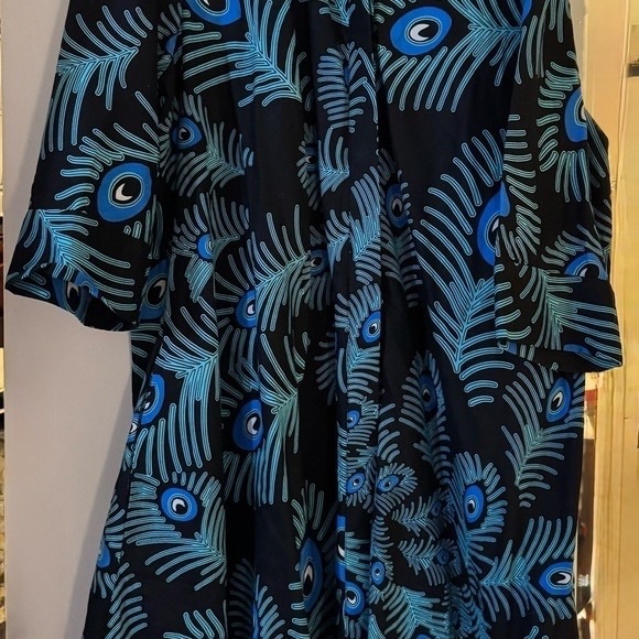 Step out in style with this elegant blue dress featuring a stunning peacock feather design. Perfect for any occasion, this dress combines comfort with a touch of sophistication.