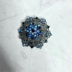Elegant Blue Rhinestone Floral Filigree Scarf Clip 2 1/4" Diameter Vintage
