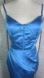 BEAUTIFUL SKY BLUE silk satin gown, likely a formal or evening dress, . This beauty featuring a fitted, boned bodice, a nipped-in waist, and a narrow skirt that flares at the bottom, strongly suggests a design reminiscent of the 1950s era. Features a shaped bodice with internal boning for structure, a lace up back for a real snatched look. Soft slit in front, delicate adjustable straps, and a gracefully draped pleating detail around the waist/hip area, adding to its elegant silhouette. 52 inches in length.