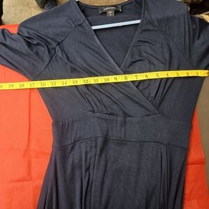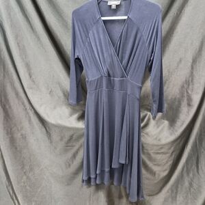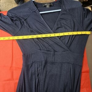 Stylish wrap dress in a deep blue shade. Features a flattering V-neck and flowing skirt.