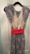 Stylish dress featuring a blue pattern on cream fabric. Accentuated with a bold red belt.
