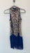 Stylish sleeveless dress with a blue and cream pattern. Features a unique fringe detail at the bottom and keyhole back
