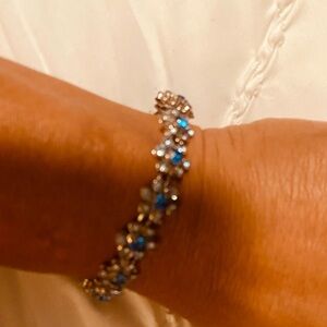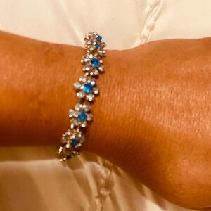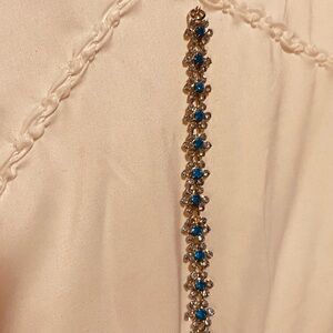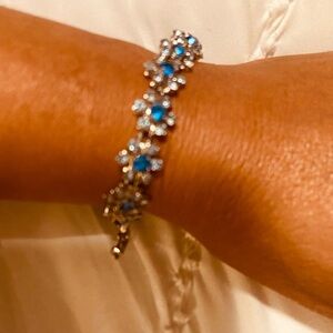 Vintage Carol Lee Rhinestone Bracelet: Silver Tone This stunning bracelet features vibrant blue stones set in a delicate gold floral design. Perfect for adding a touch of elegance to any outfit.perfect for a bridal something blue very Beautiful in person