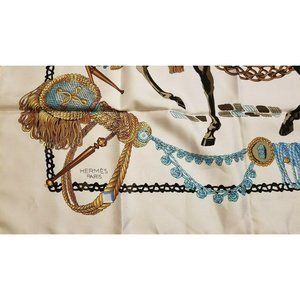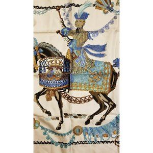 This elegant scarf features a stunning blue and gold design, perfect for adding a touch of sophistication to any outfit.