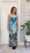 This stunning strapless dress features a vibrant blue lace bodice and a multicolor patterned skirt. Perfect for any occasion, it combines elegance with a bold design.