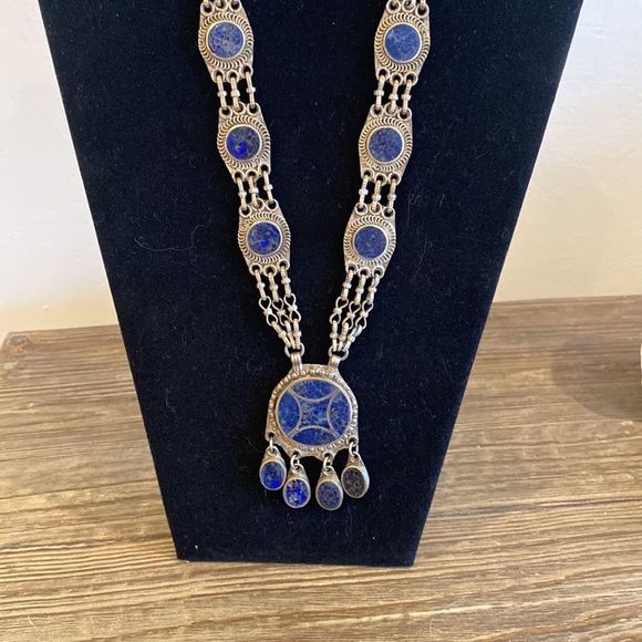 This stunning necklace features intricate blue and silver detailing, perfect for adding a touch of elegance to any outfit.