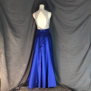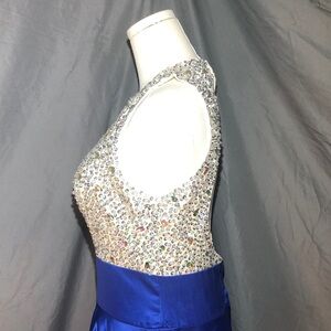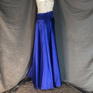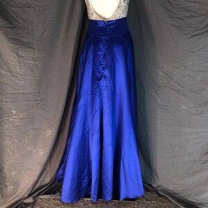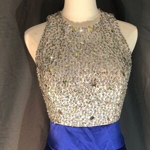 Shine in this elegant blue and silver dress, perfect for any special occasion. The shimmering top adds a touch of glamour. Sequin details are amazing on the white background of the dress. Sequins have glints of gold, silver, pink and even light greens! Dress is a size medium or large. Full skirt can be worn with a ruffled slip under it to accentuate the flare. Underarm to underarm measures 16”. Dress length is 56 1/2” long from shoulder to hem.