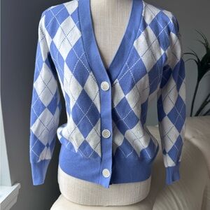 Discover timeless elegance with this blue and white argyle cardigan. Perfect for any occasion, it offers both style and comfort.