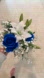 This homemade bouquet features (3) blue royal blue silk roses, (3) real touch white lilies, and faux, real-touch baby’s breath. Perfect for prom/homecoming/wedding. Stems wrapped in royal blue, silk ribbon with rhinestones enhancements.