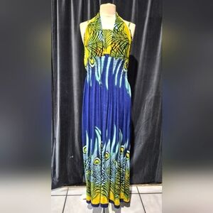 This stunning halter maxi dress features a vibrant blue and yellow design, perfect for making a statement. Ideal for any occasion, it combines comfort with style.