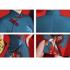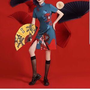 LAI MENG FIVE CATS Women's Vintage Chinese Cheongsam Print Short Sleeve Retro Side Slit Mini Dress