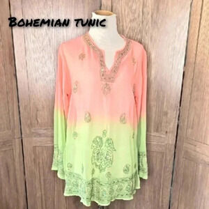 Elegant BohemianPeach and Green Embroidered sequin Women's Top tunic
