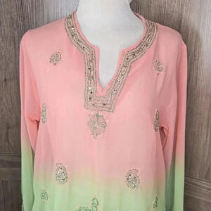 This elegant women's top features a beautiful peach and green gradient with intricate embroidery. Perfect for adding a touch of sophistication to your wardrobe.