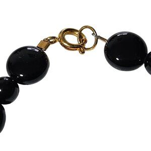 A stylish bracelet featuring black beads and a swirled purple centerpiece. It is secured with a gold tone clasp, adding a touch of elegance.