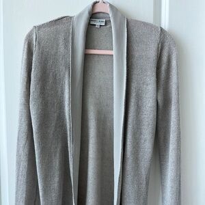 Timeless and refined, this open-front cardigan by Bongenie Grieder is crafted in a soft 100% linen knit with a contrasting silky lapel for added elegance. The light taupe/grey tone pairs beautifully with both casual and dressy outfits. Breathable, lightweight, and perfect for layering year-round. Gently worn and in excellent condition – no flaws.