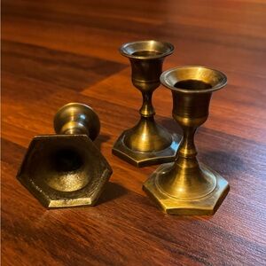Enhance your home decor with this elegant set of three brass candle holders. Their gold finish adds a touch of sophistication to any room. Perfect for creating a warm, inviting atmosphere.