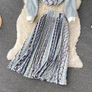 Elegant Breasted Print Tops And Midi Skirt Set