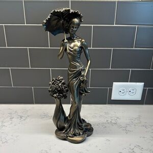 Springtime Promenade Bronze Finish 14 3/4" High Sculpture Woman This exquisite bronze statue features a graceful lady holding an umbrella, adding a touch of elegance to any home decor. The intricate details and bronze finish make it a standout piece.