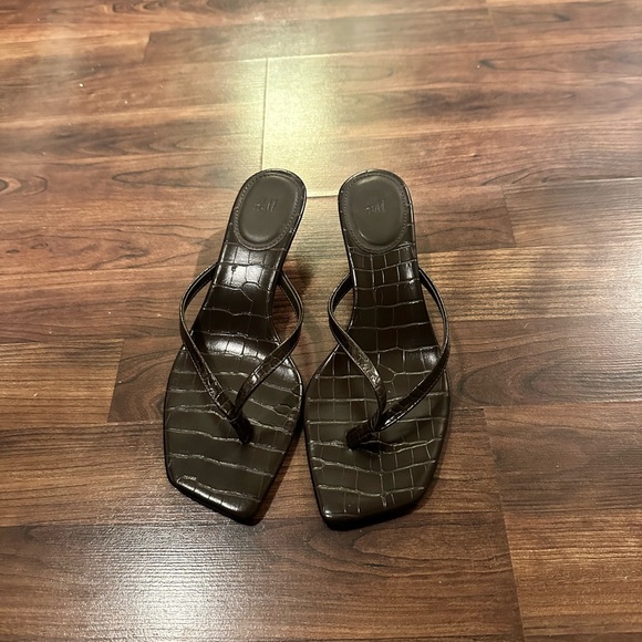 Elegant brown croc-embossed women's flip flop kitten heel sandals. Worn once