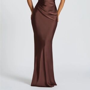 This elegant brown maxi dress is perfect for any formal occasion. Its sleek design and rich color make it a standout piece in any wardrobe. Great bridesmaid dress. Runs a bit tight. Worn once still with tag and dry cleaned.