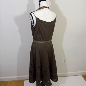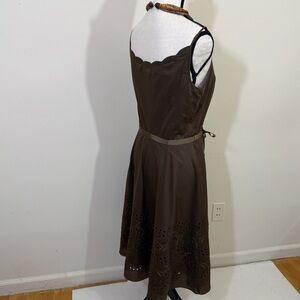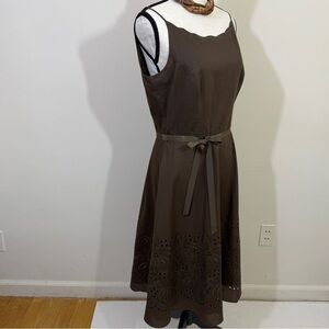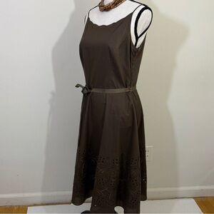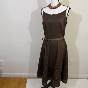 Discover elegance with this chic brown sleeveless midi dress. Perfect for any occasion, it offers a stylish and comfortable fit. The bottom of the skirt has a nice eyelet detail. It covers about 10”. The fit and flair style has the spaghetti straps Darts at the bust line. Zipper on the back. The waistline has a ribbon to tie as desired. No visible flaws Questions please Measurements are pit to pit about 18”. The total length if dress including half of the straps is about is about 42”. Questions please ask and we will answer ASAP