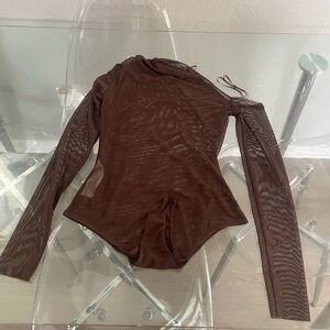 This elegant brown sheer bodysuit offers a chic and sophisticated look. Perfect for any occasion, it features a stylish design that complements any wardrobe.