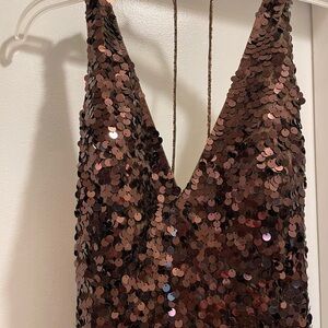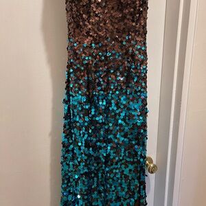 Shimmer and shine in this stunning brown and blue sequin dress. Perfect for special occasions, this dress offers a flattering fit and eye-catching design with a halter neck and fit to hug and enhance your curves. Perfect for prom, pageants, weddings, and more!
