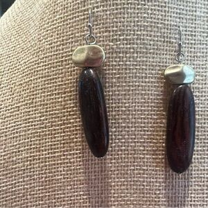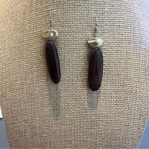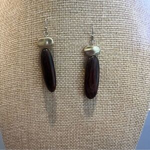 These elegant earrings feature a stunning combination of brown and gold tones, perfect for adding a touch of sophistication to any outfit. Dangles Approx. 1 3/4" from Ear Hook. Brown bead looks like faux polished wood