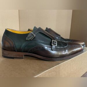Elevate your formal attire with these elegant men's monk strap oxfords, featuring a sophisticated blend of brown and green. Perfect for any occasion.