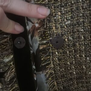 Brown and gold tweed blazer with snap button closure. Fits like a size medium. Adorable inner floral lining. Metallic tweed with fringe. Excellent condition. Smoke free home. Pit to pit 18.5 inches back of collar to hem 21.5 inches