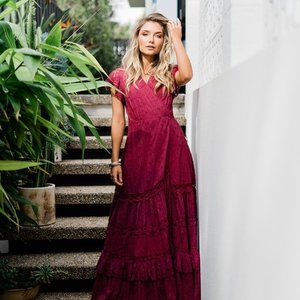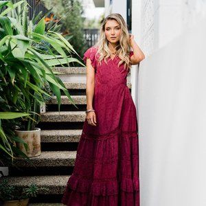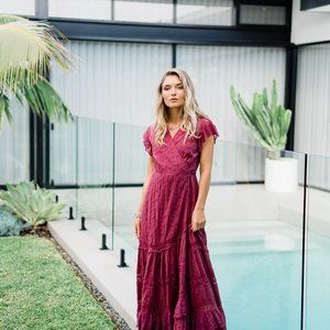 Step out in style with this elegant burgundy maxi dress from House of Skye. Perfect for any occasion, this dress offers a flattering fit and a touch of sophistication. Incredible details & craftsmanship. Size small.